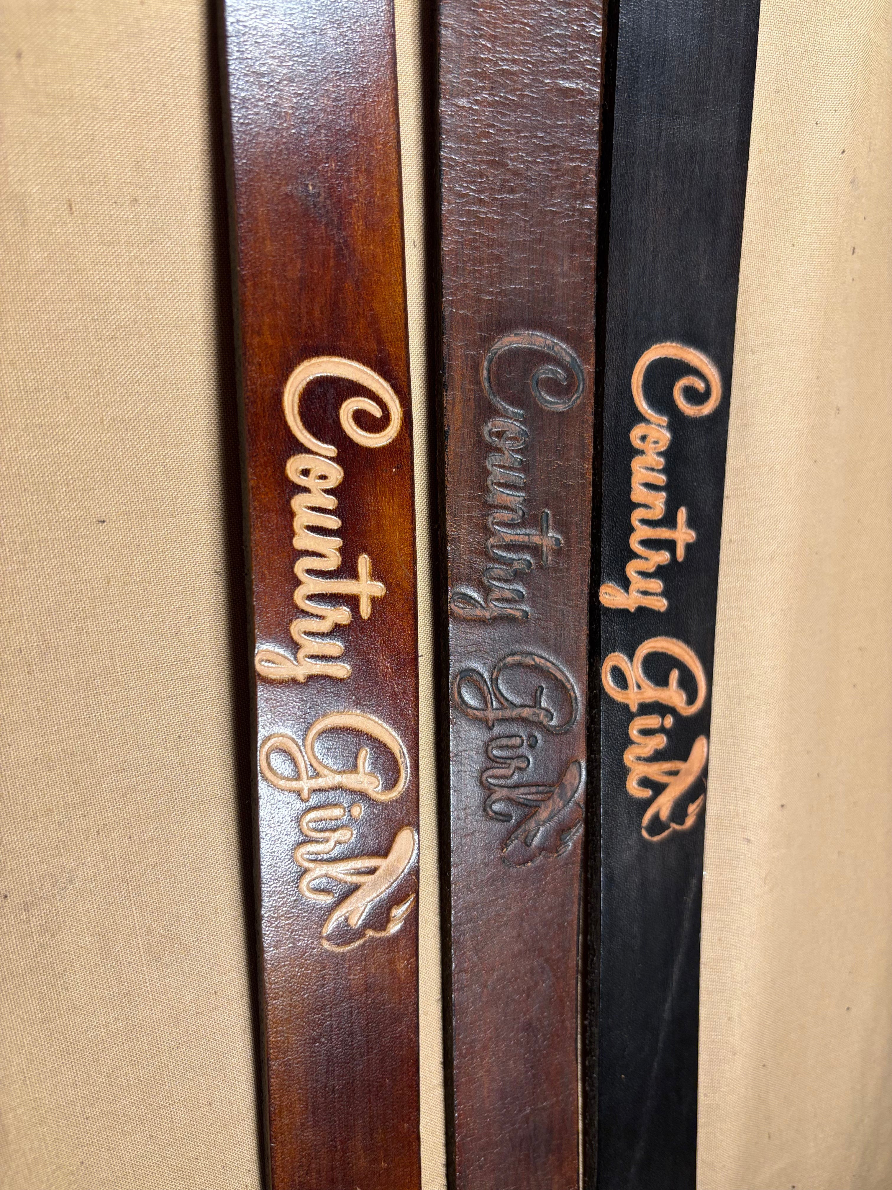 The Country Girl design is a fun statement belt imprinted with the words Country Girl stamped along the length of the belt. Like all of our belts, the Country Girl is made from 100% genuine cowhide leather and is guaranteed for quality and style. Perfect for the southern bell in your life.
